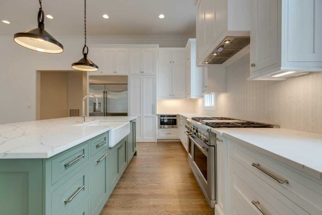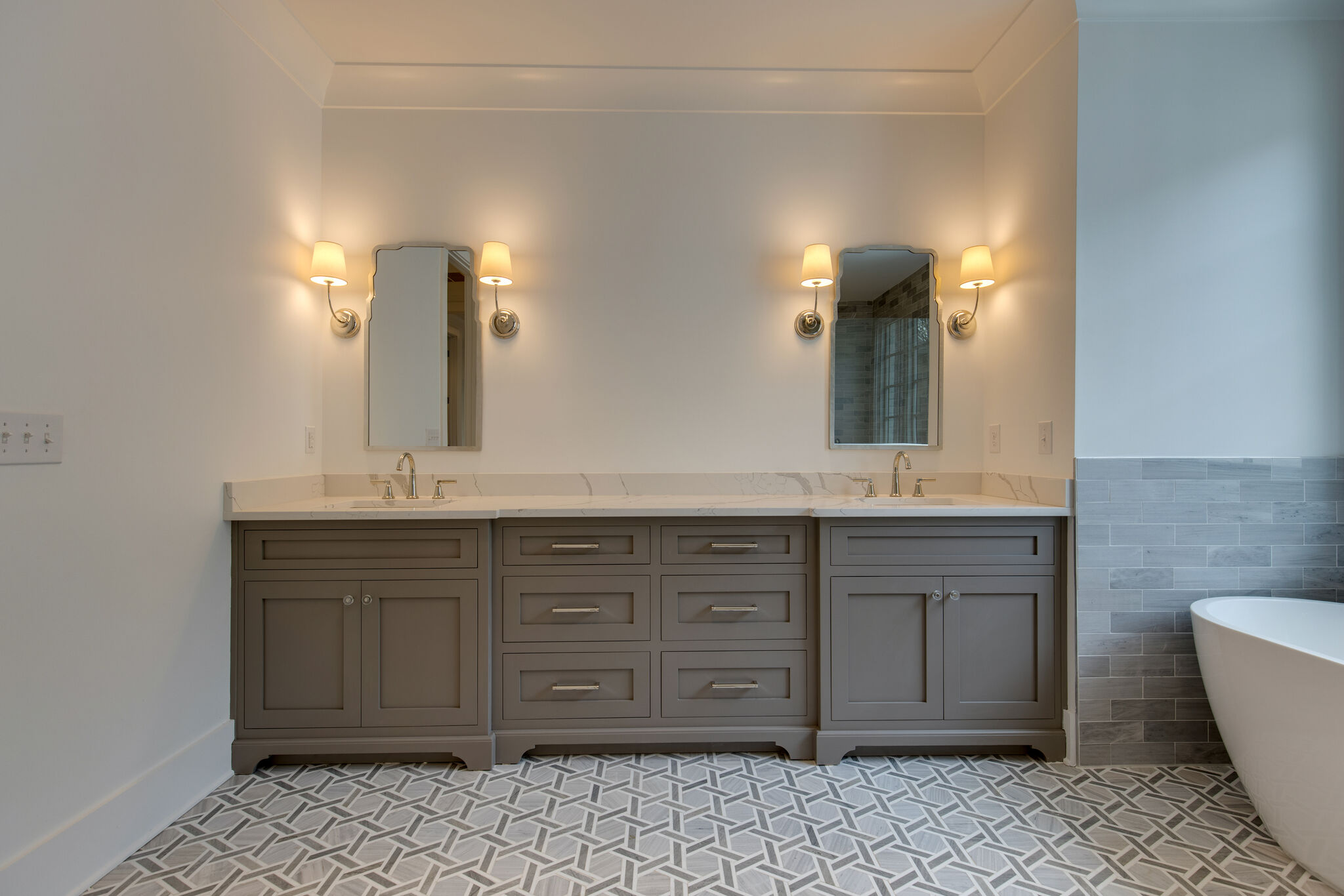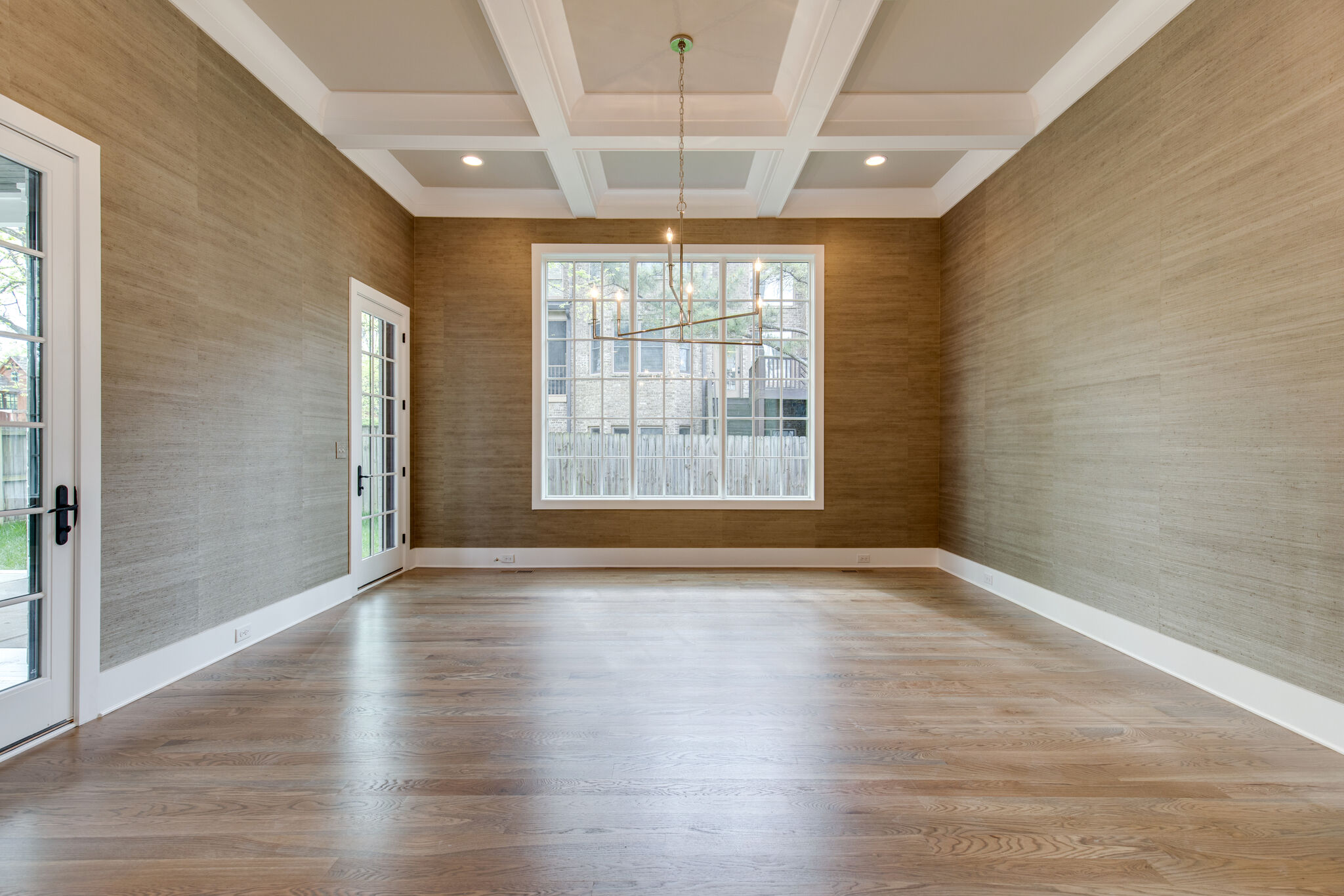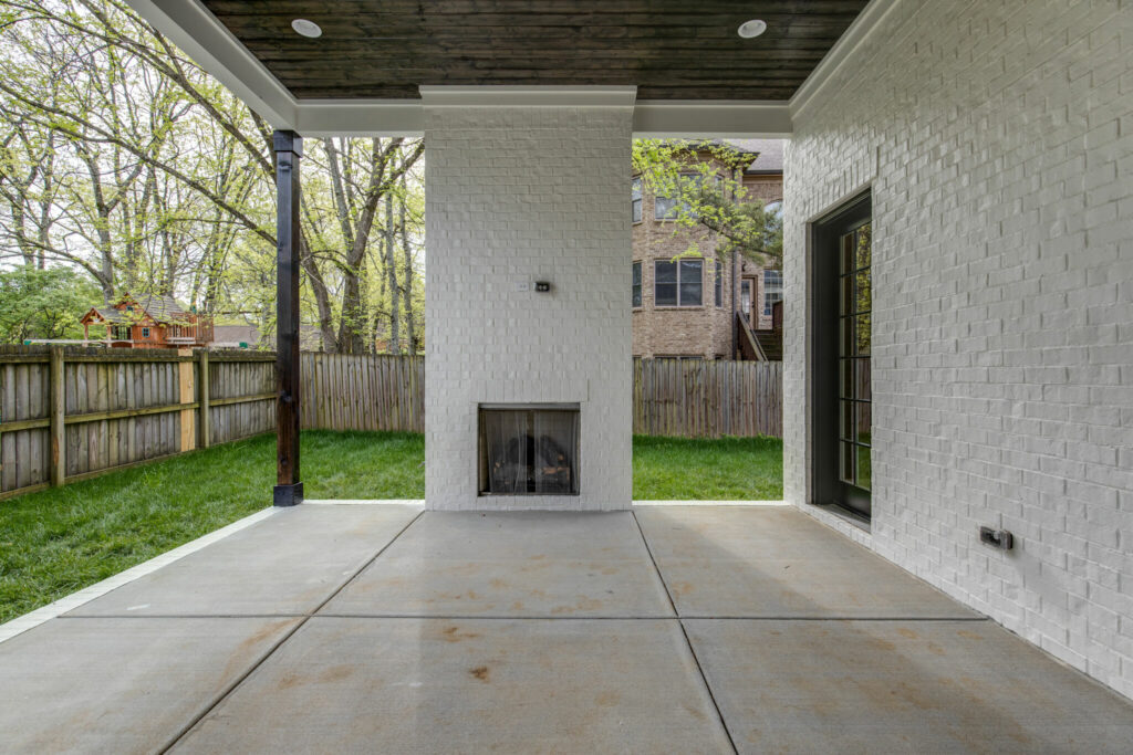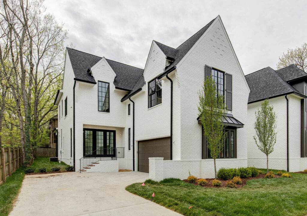 This stunning Green Hills new construction blends European elegance with modern luxury across 4,085 square feet. Inside, rich hardwood floors flow throughout, complemented by coffered ceilings with grasscloth wallcovering and thoughtful architectural details. The gourmet kitchen features crisp white cabinetry, a sage green island, professional-grade appliances, and industrial-style pendant lighting. The primary bath offers dual vanities in soft gray, geometric tile flooring, and a sculptural freestanding tub. Outdoors, a covered patio with stained wood ceiling, painted brick walls, and a built-in fireplace extends the living space. With its striking painted brick exterior, black steel-framed windows, and distinctive gabled rooflines, this 4-bedroom, 4.5-bath home delivers sophisticated living in a prime Nashville location.