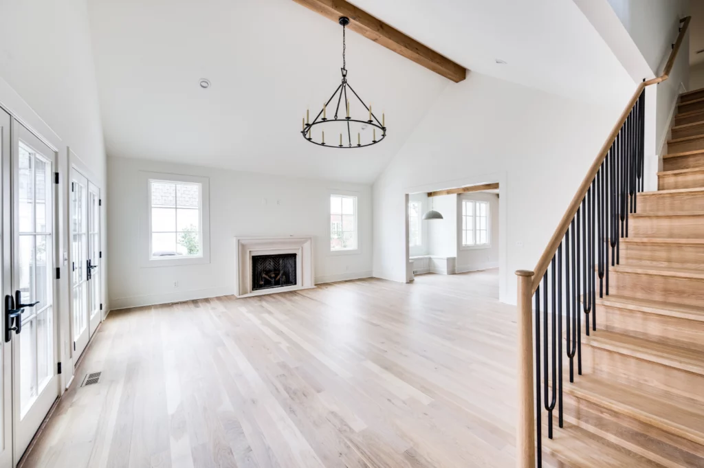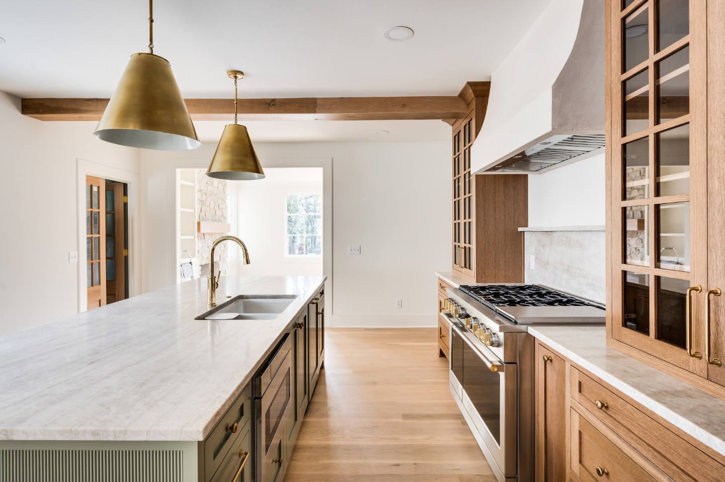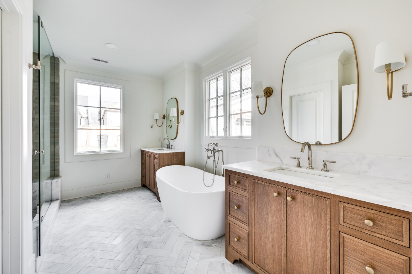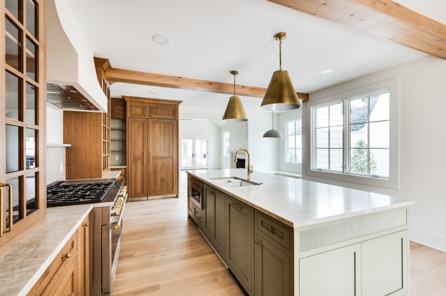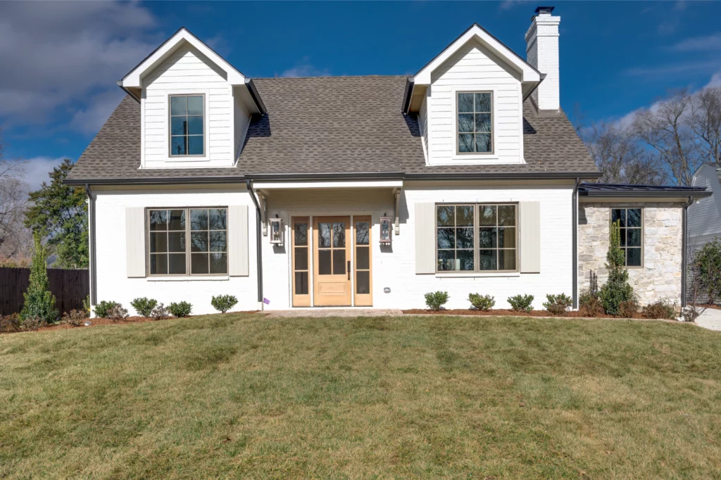 This exquisitely crafted Green Hills residence showcases modern farmhouse design with sophisticated finishes throughout 3,992 square feet. Inside, wide-plank white oak floors complement vaulted ceilings with exposed wood beams and custom metal stair railings. The chef’s kitchen features floor-to-ceiling natural wood cabinetry, a sage green island with waterfall-edge countertops, and brass cone pendant lighting. The spa-like primary bath offers a freestanding soaking tub, expansive marble flooring, custom wood vanity, and statement brass fixtures with geometric mirrors. With its crisp white exterior, dual dormers with black-framed windows, and natural stone accents, this 5-bedroom, 4-bath home delivers refined comfort and timeless appeal.