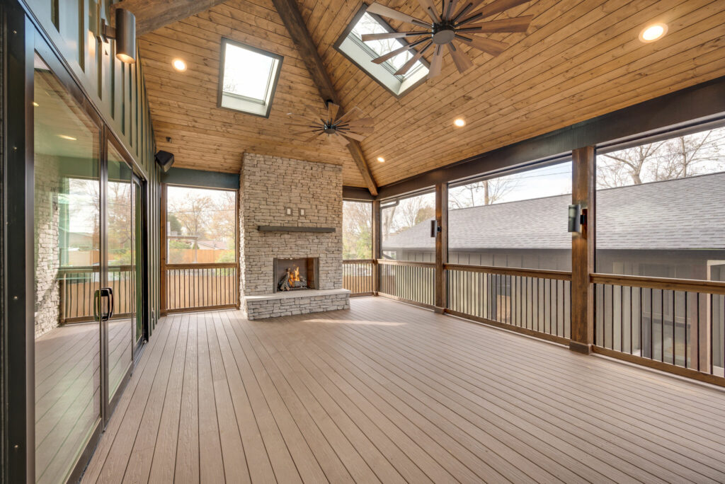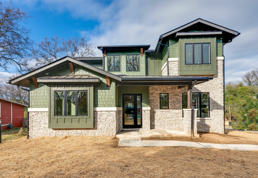 This striking Sylvan Park home showcases modern craftsman design with mountain-inspired details across 2,734 square feet. Inside, rich dark hardwood floors complement an open-concept layout filled with natural light. The gourmet kitchen features soft gray shaker cabinetry, a generous waterfall-edge island, stacked stone backsplash, and floor-to-ceiling pantry storage. The screened porch becomes a true outdoor living room with vaulted tongue-and-groove wood ceiling, skylights, a stone fireplace, and seamless access through oversized sliding glass doors. The primary bath offers dual vanities in espresso with marble countertops, a sculptural freestanding tub with chevron tile surround, and clean white shiplap walls. With its distinctive sage green board-and-batten siding, natural stone accents, and prairie-style windows, this 4-bedroom, 3.5-bath residence delivers contemporary mountain living in the heart of Nashville.
