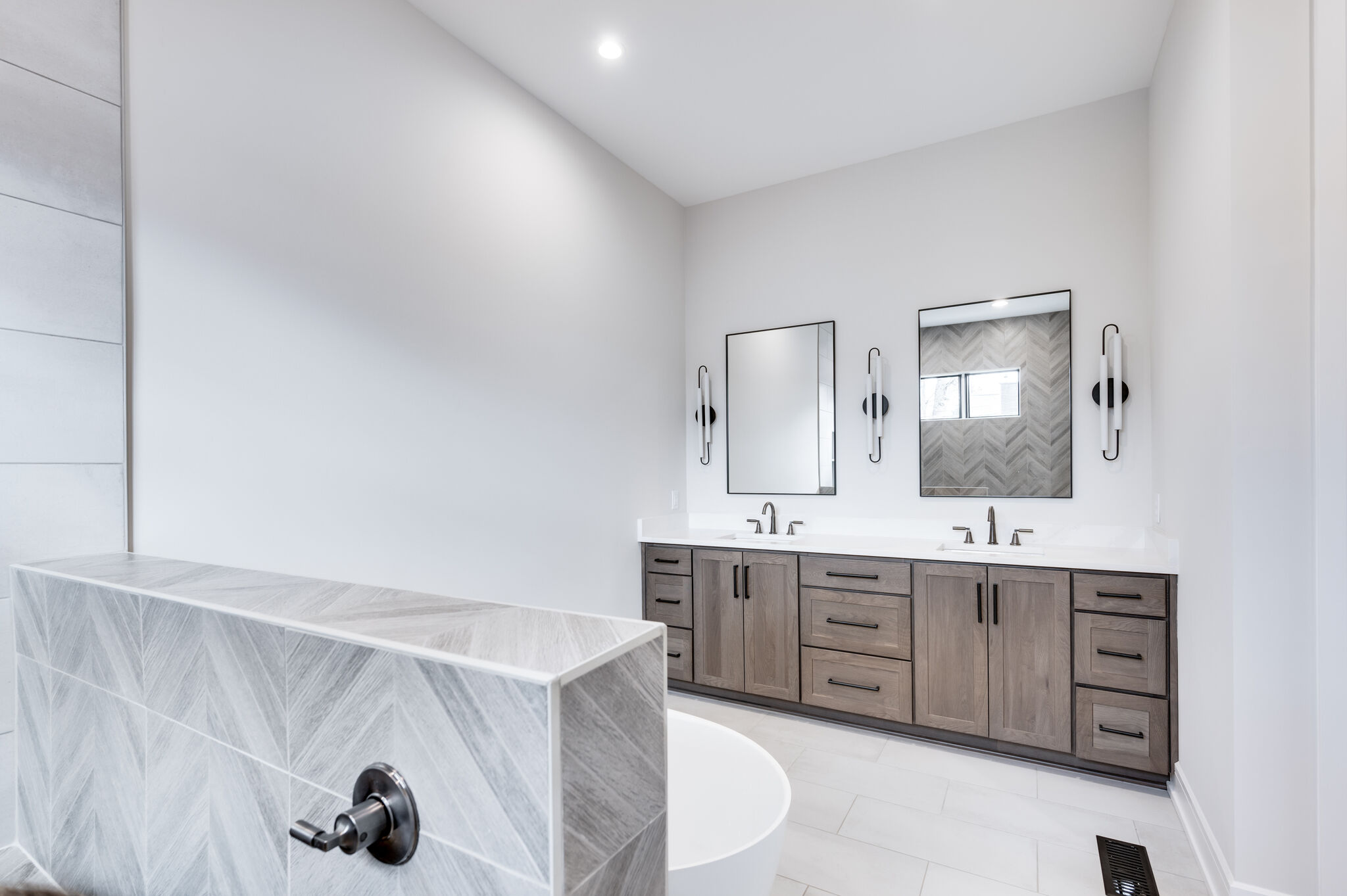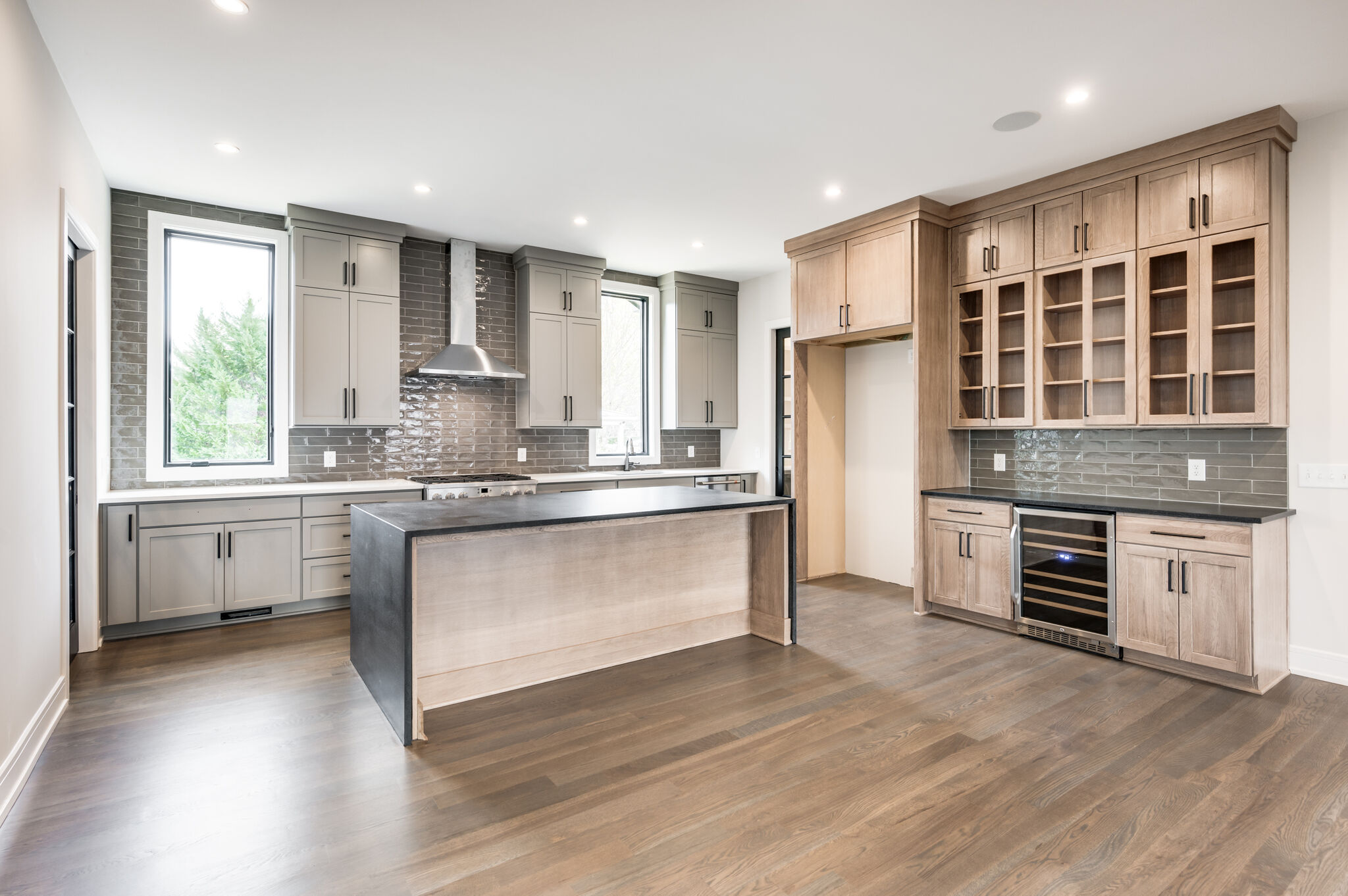 This striking Sylvan Park home showcases modern craftsman design with mountain-inspired details across 2,734 square feet. Inside, rich dark hardwood floors complement an open-concept layout filled with natural light. The gourmet kitchen features soft gray shaker cabinetry, a generous waterfall-edge island, stacked stone backsplash, and floor-to-ceiling pantry storage. The screened porch becomes a true outdoor living room with vaulted tongue-and-groove wood ceiling, skylights, a stone fireplace, and seamless access through oversized sliding glass doors. The primary bath offers dual vanities in espresso with marble countertops, a sculptural freestanding tub with chevron tile surround, and clean white shiplap walls. With its distinctive sage green board-and-batten siding, natural stone accents, and prairie-style windows, this 4-bedroom, 3.5-bath residence delivers contemporary mountain living in the heart of Nashville.