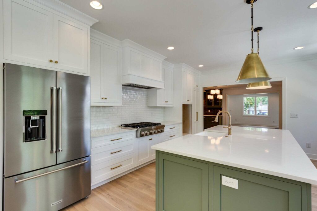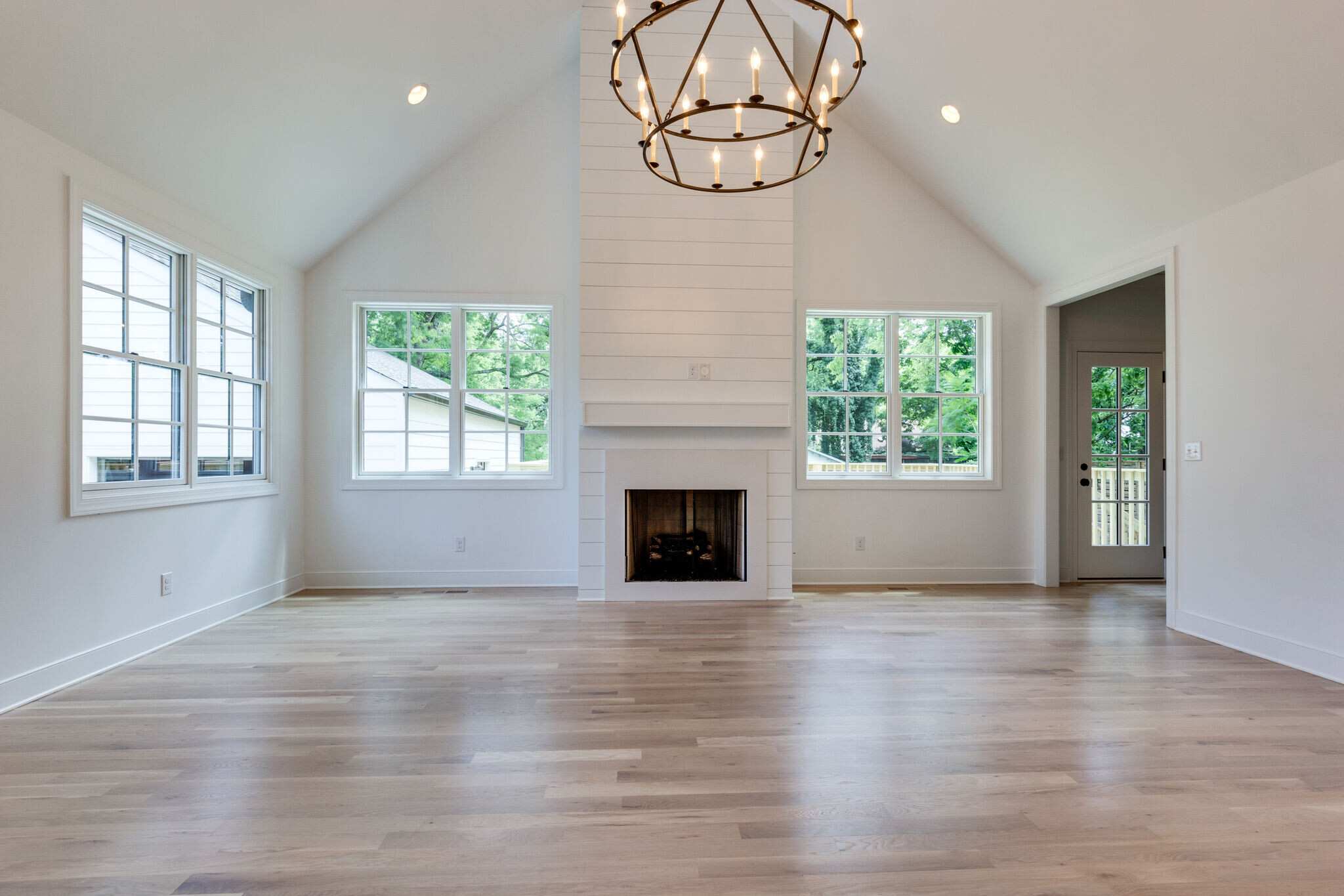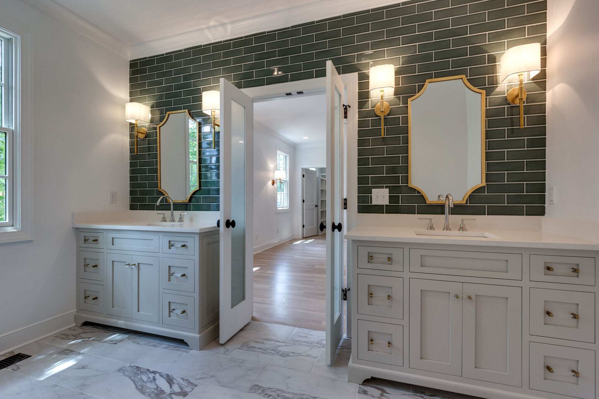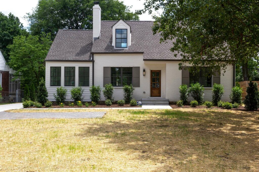 This beautifully reimagined 12 South home blends classic cottage charm with contemporary refinement across 3,879 square feet. Inside, light hardwood floors flow through open living spaces, highlighted by vaulted ceilings with shiplap accents and thoughtful architectural details. The kitchen features crisp white cabinetry, a sage green island, professional-grade appliances, and brass cone pendant lighting. The spacious great room offers a gas fireplace flanked by large windows and a statement geometric chandelier, creating an inviting gathering space. The primary bath showcases dual furniture-style vanities in soft gray, dramatic dark green subway tile accent wall, gold-framed mirrors, and elegant marble flooring. With its painted brick exterior, distinctive dormer window, and meticulously landscaped frontage, this 5-bedroom, 4.5-bath residence delivers timeless elegance in one of Nashville’s most walkable neighborhoods.